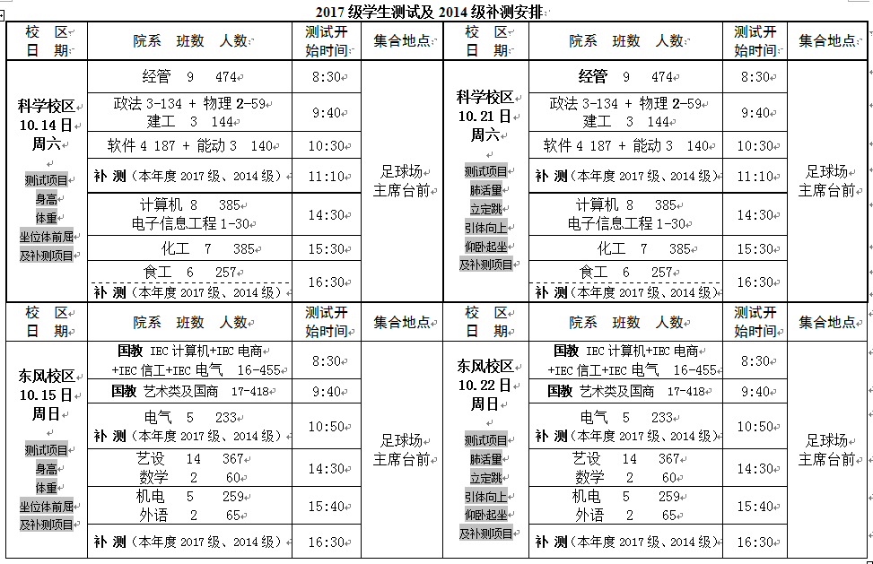 根据“教育部、国家体育总局关于实施《国家学生体质健康标准》的通知”的精神,我校将对2017级本科学生及2014级需补测学生进行体质健康测试,