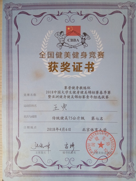 4月3—7日,由中国健美协会、中国大学生体育协会、北京体育大学主办,北京赛普力量教育科技有限公司承办的2018中国大学生健身健美锦标赛(春季赛)暨亚洲健身健美锦标赛青年组选拔赛在北京体育大学举办,我校自拍流出 14级社会体育指导与管理专业王典同学荣获传统健美75公斤级第七名。
