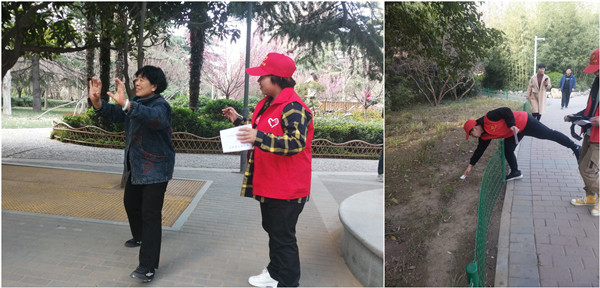 活动中,志愿者们通过发放调查问卷、访谈等形式,深入了解了参加健身活动的老年人的身体健康状况、健身参与现状以及对健身环境和指导的需求。志愿者们重点向老年人讲解了健身过程中的注意事项,对参与健身活动的老年人进行健身方法的指导,并结合老年人的身体状况给予合理的健身建议。随后,志愿者们还对公园里路面、草丛、树林、卫生死角的落叶、纸屑、塑料瓶等杂物进行清理打扫,并收纳进垃圾袋,最后送至垃圾箱中。