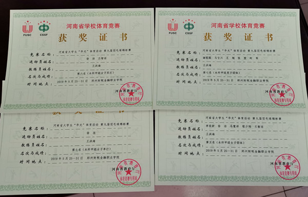 5月25日至6月1日,河南省大学生“华光”体育活动第九届羽毛球锦标赛在郑州财税金融职业学院举行。我校派出了男女共10名运动员在主教练王洪海老师的带领下参与了本次比赛并取得了优异的成绩。