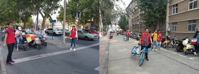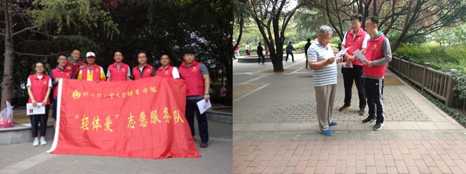 活动中,学院先后组织教师在学校东风校区校园内开展了“绿城啄木鸟”单车卫士志愿服务活动,在东风路园田路口开展“关爱生命,倡导文明出行”主题志愿服务活动,走进东风路街道办社区,为晨练老年人宣讲健身知识和开展文体活动注意事项等志愿服务活动。