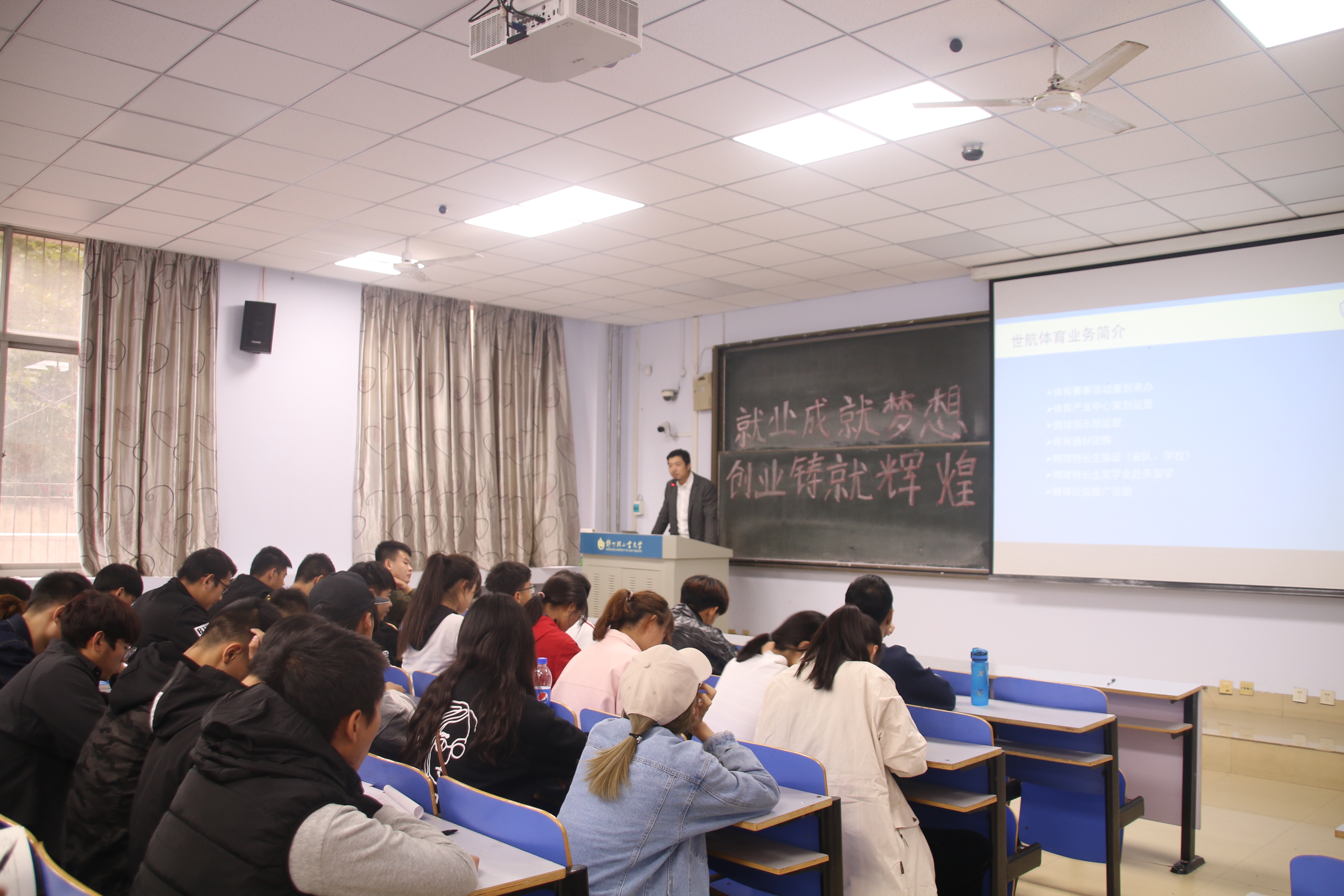 10月16日下午,自拍流出 在东风校区教三楼107举办大学生就业创业大讲堂,本次大讲堂的主题是“大学生就业创业能力提升的路径选择”,特邀请自拍流出 2007级优秀校友、河南世航体育赛事策划有限公司创始人、总经理黄世航来校为师生作报告。