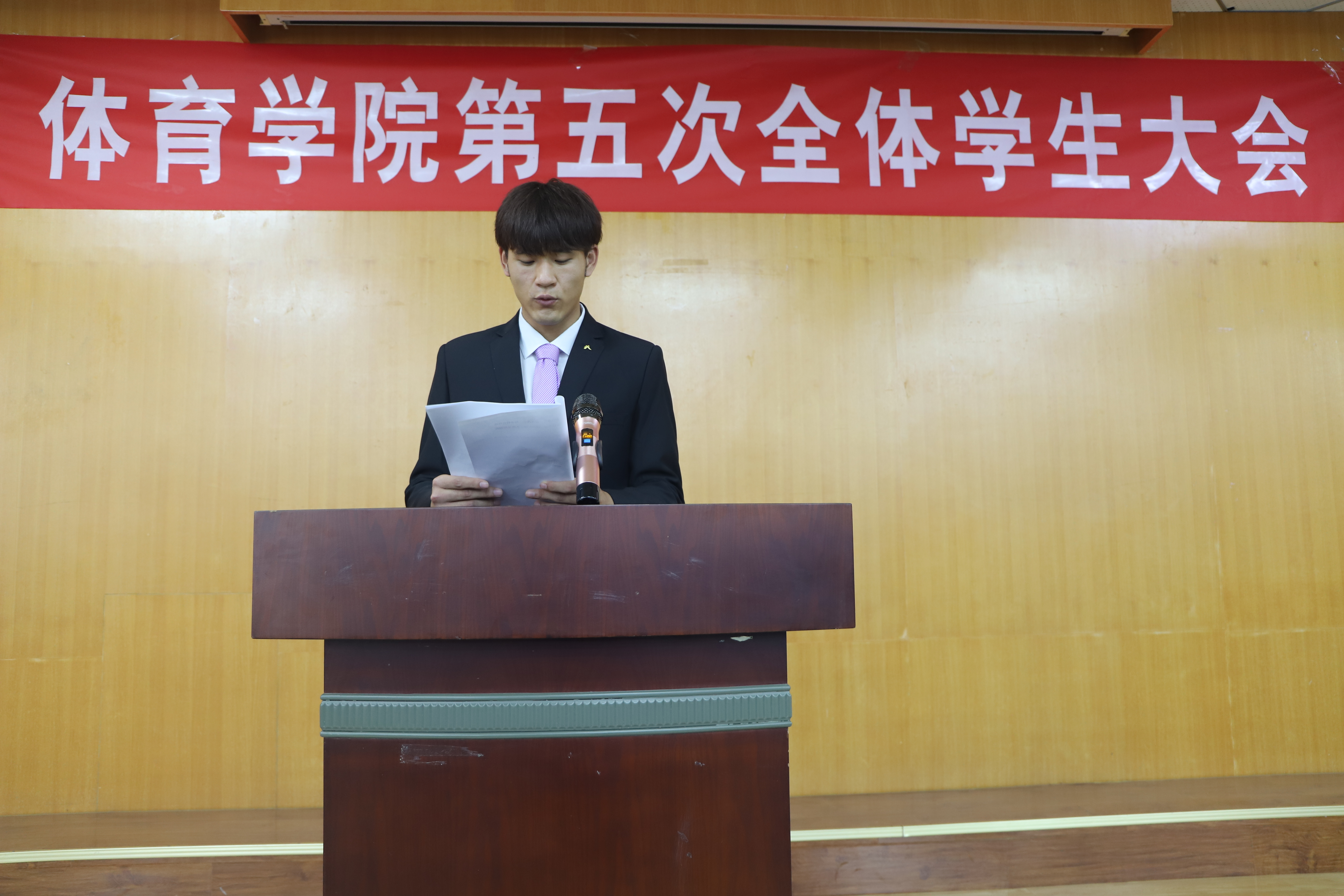 校学生会主席团成员吴苏霖同学代表校学生会向大会致辞。他对体育学院第五次全体学生大会的顺利召开表示了祝贺,对自拍流出 学生会近一年来取得的成绩给予了充分肯定。同时,他希望自拍流出 学生会以饱满的热情和高度的责任感投身到接下来的各项工作中,凝心聚力,团结奋进,努力开创学生会工作新局面。