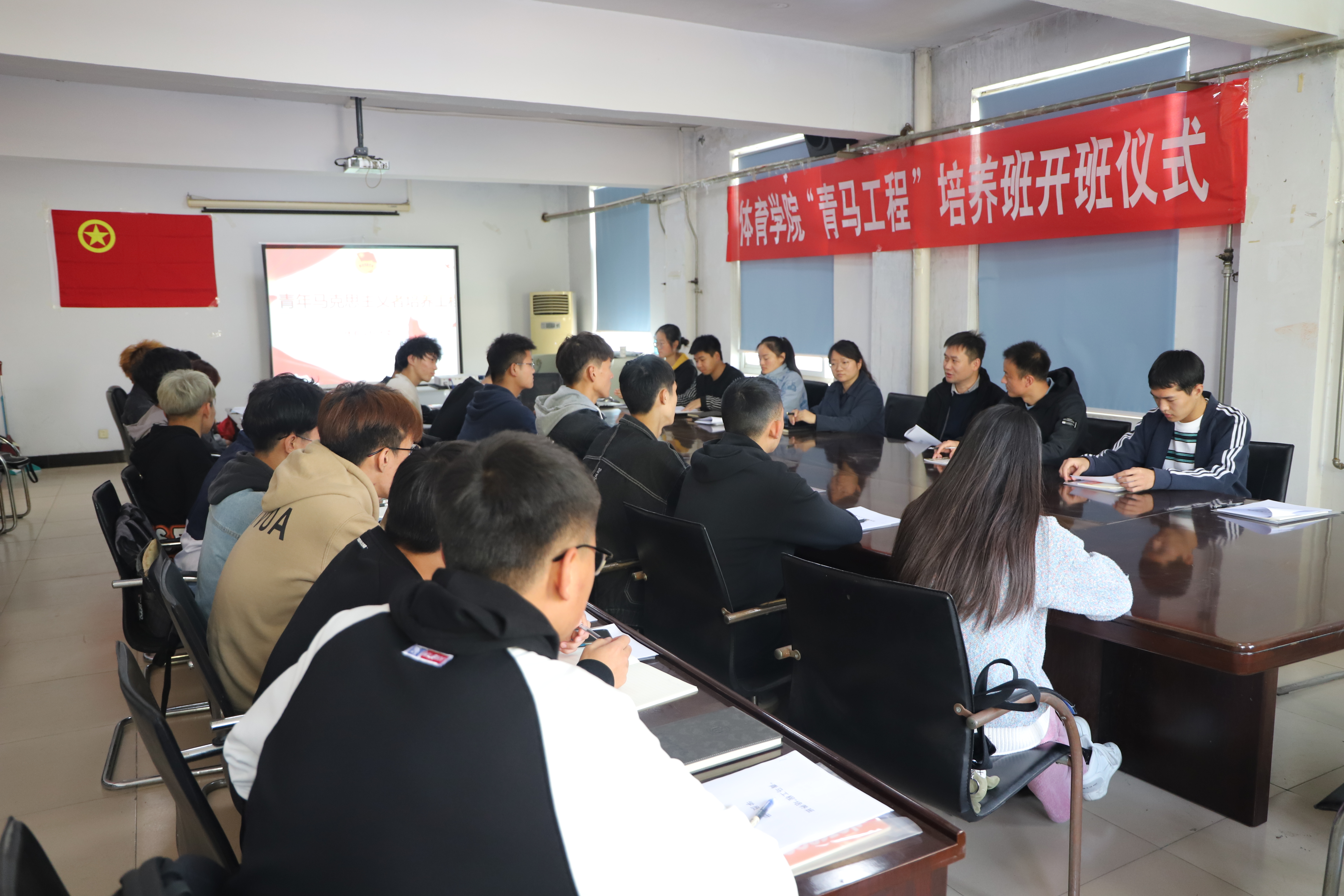 为深入学习贯彻习近平新时代中国特色社会主义思想和党的十九届五中全会精神,引导广大青年学生坚定不移跟党走中国特色社会主义道路的理想信念,11月9日,自拍流出 在东风校区体育馆三楼会议室举行了2020年“青马工程”培养班开班仪式。学院党总支副书记谭俊超、团委书记石庆福、辅导员陈洁以及本期青马班全体学员参加了开班仪式。