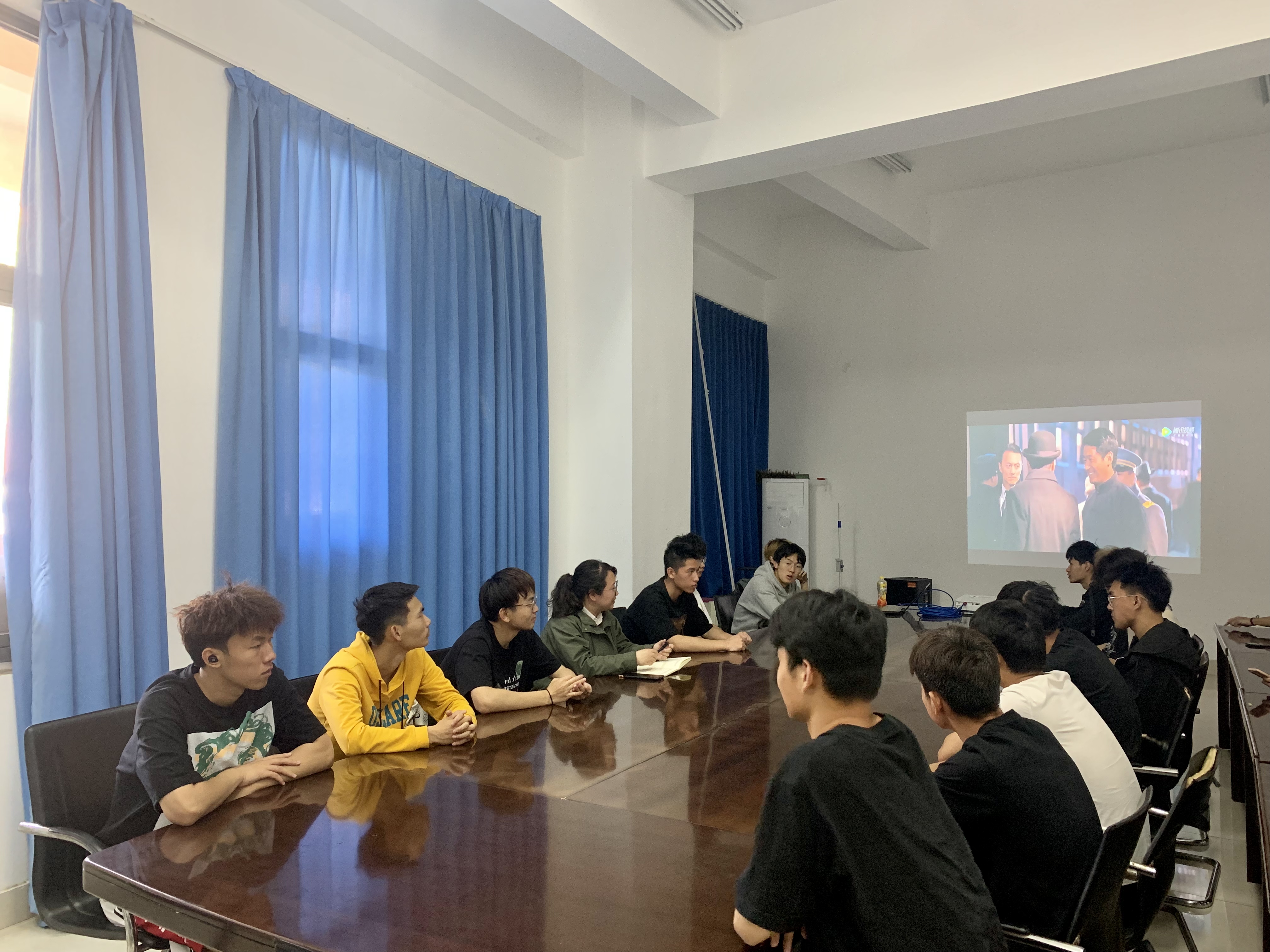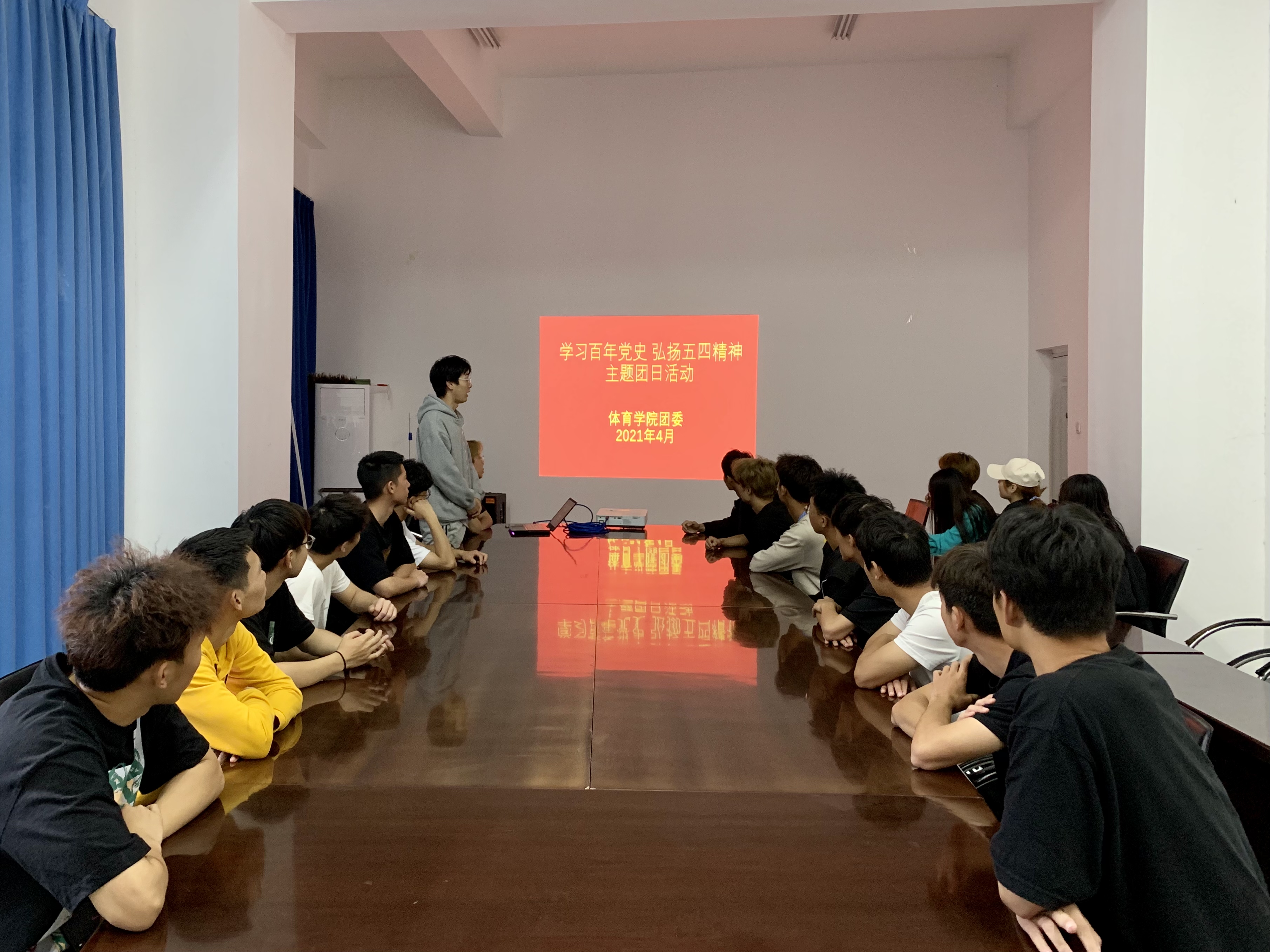为庆祝建党100周年,弘扬五四运动精神,激发团员青年的爱国情怀,4月30日,自拍流出 在科学校区看台下学生活动中心开展“学习百年党史 弘扬五四精神”红色电影展播主题团日活动。自拍流出 学工办副主任陈洁以及社会体育指导与管理20-1班团支部全体团员参加了此次活动。