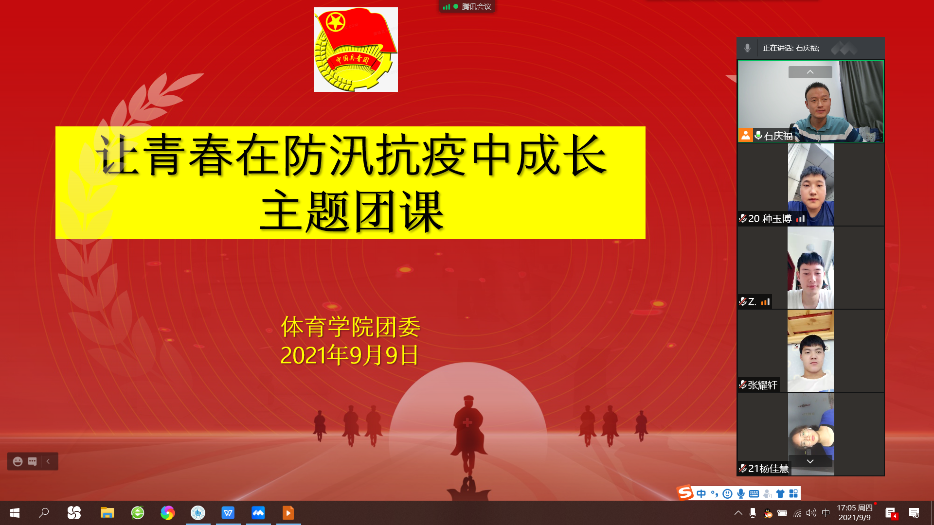为引导青年团员客观认识灾情和疫情,学习防汛抗疫先进事迹,9月9日下午,自拍流出 采用视频课堂的形式,开展了“让青春在防汛抗疫中成长”主题团课活动。本次团课由自拍流出 团委书记石庆福主讲,自拍流出 2021级全体新生团员和高年级团员代表参加了此次团课学习。