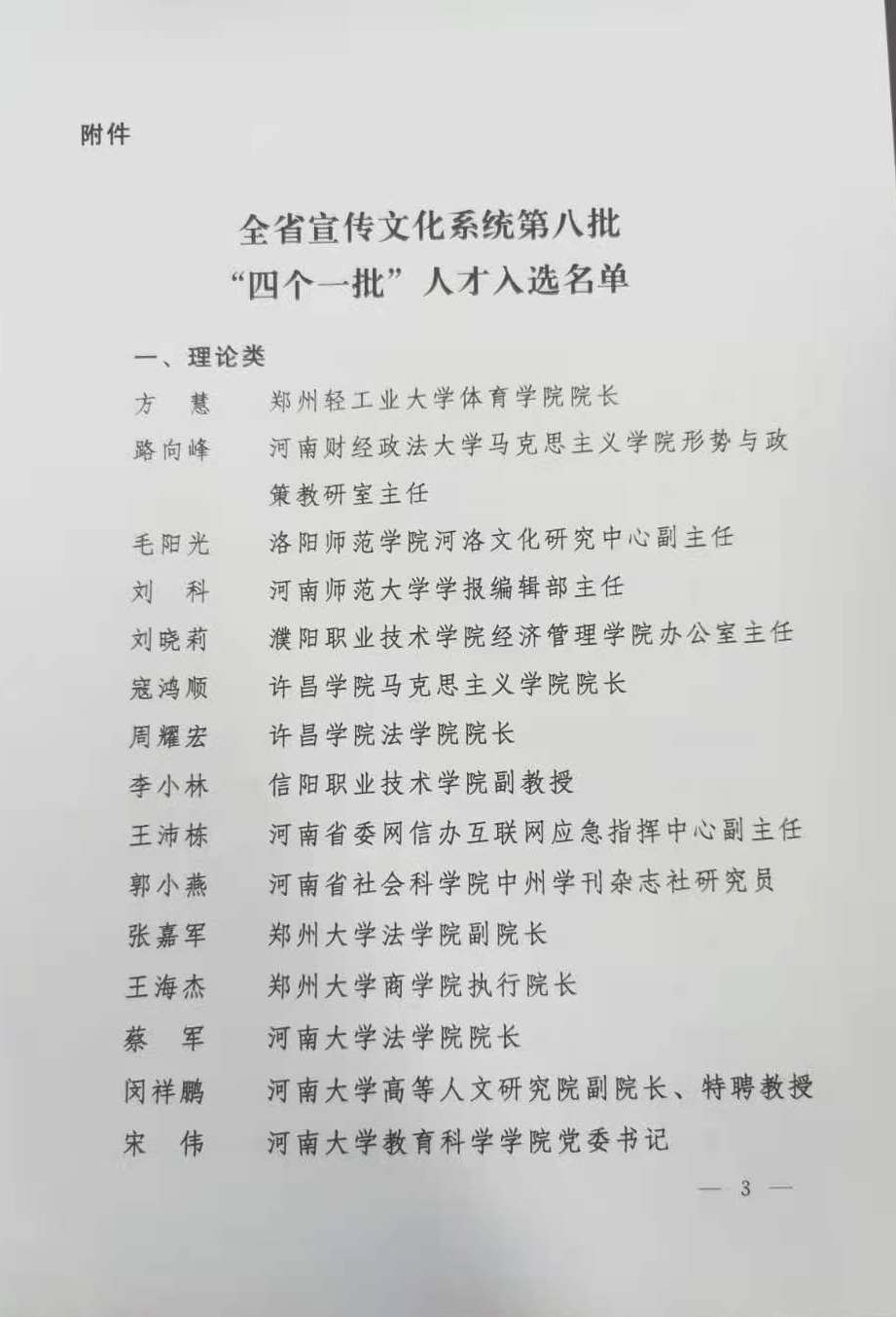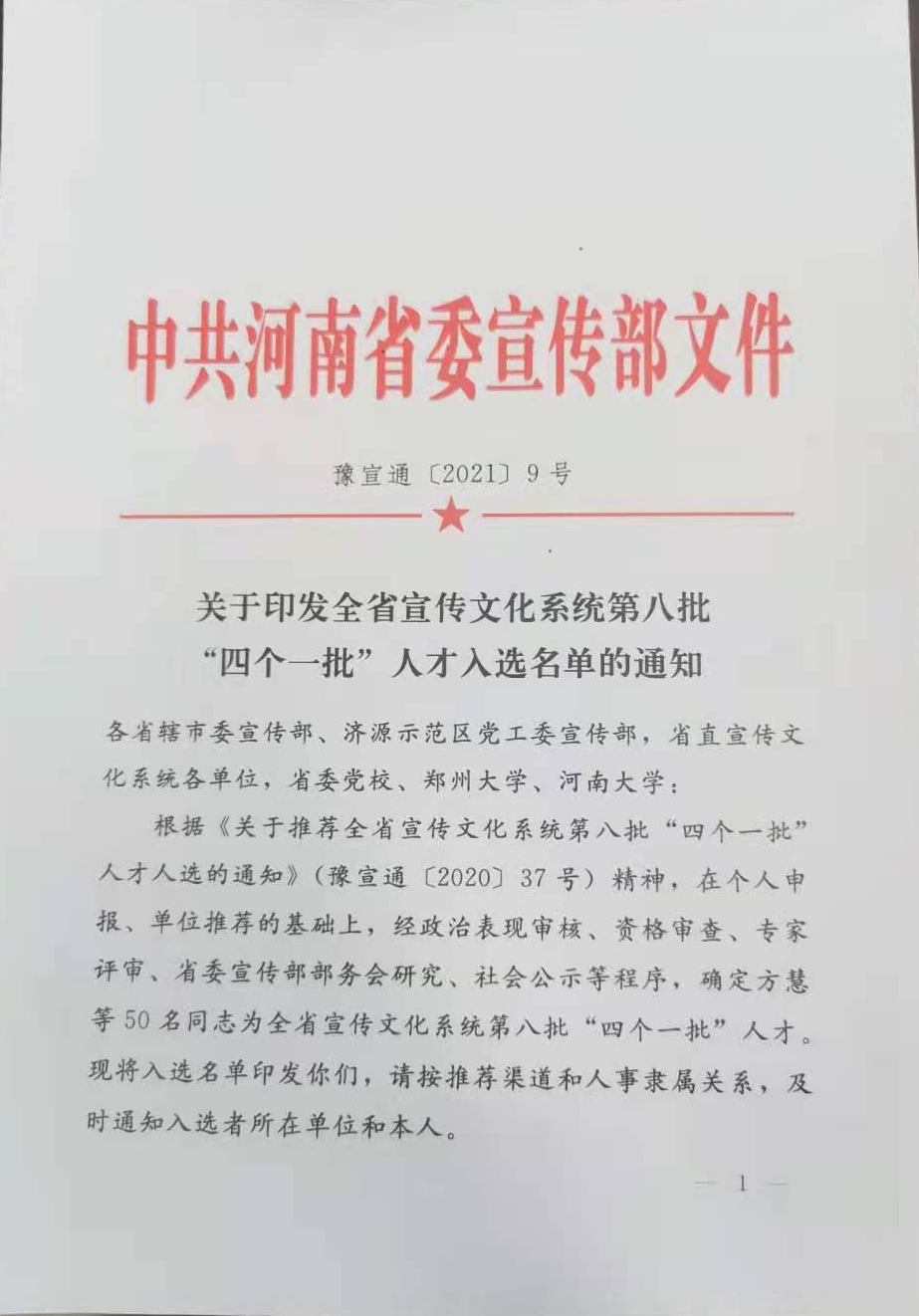河南高等教育教学改革研究与实践项目成果展示三:课题组成员方慧教授被授予中共河南省委宣传部“四个一批”人才称号