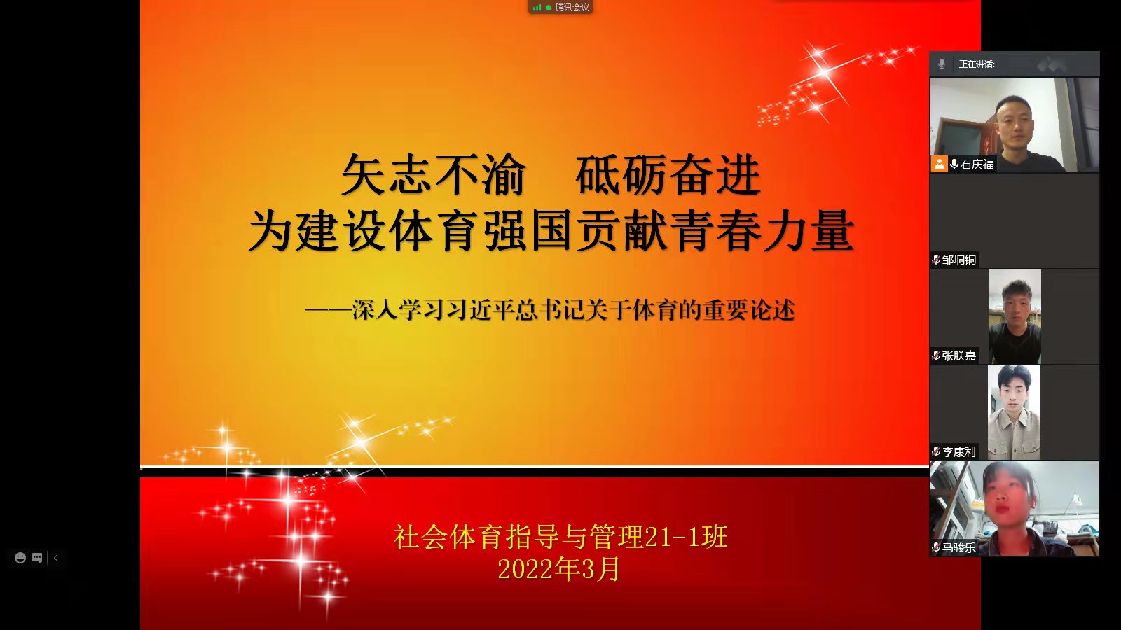 为深入贯彻习近平总书记关于“大思政”建设的重要指示精神,按照学校《关于开展辅导员“春季思政课”主题班会活动的通知》要求,体育学院近期组织各年级辅导员通过线上线下相结合的方式召开“春季思政课”主题班会。