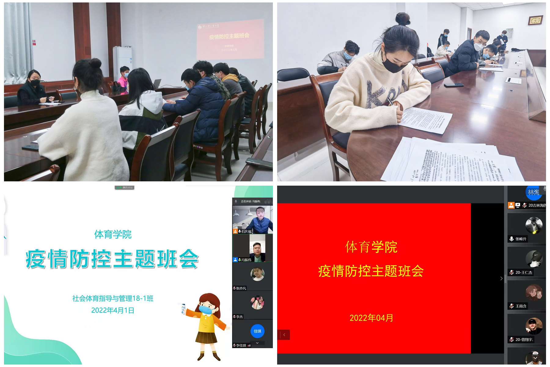 为提高学生疫情防控意识,加强遵规守纪教育,3月31日至4月1日,体育学院组织各年级通过线上线下相结合的方式召开疫情防控主题班会。