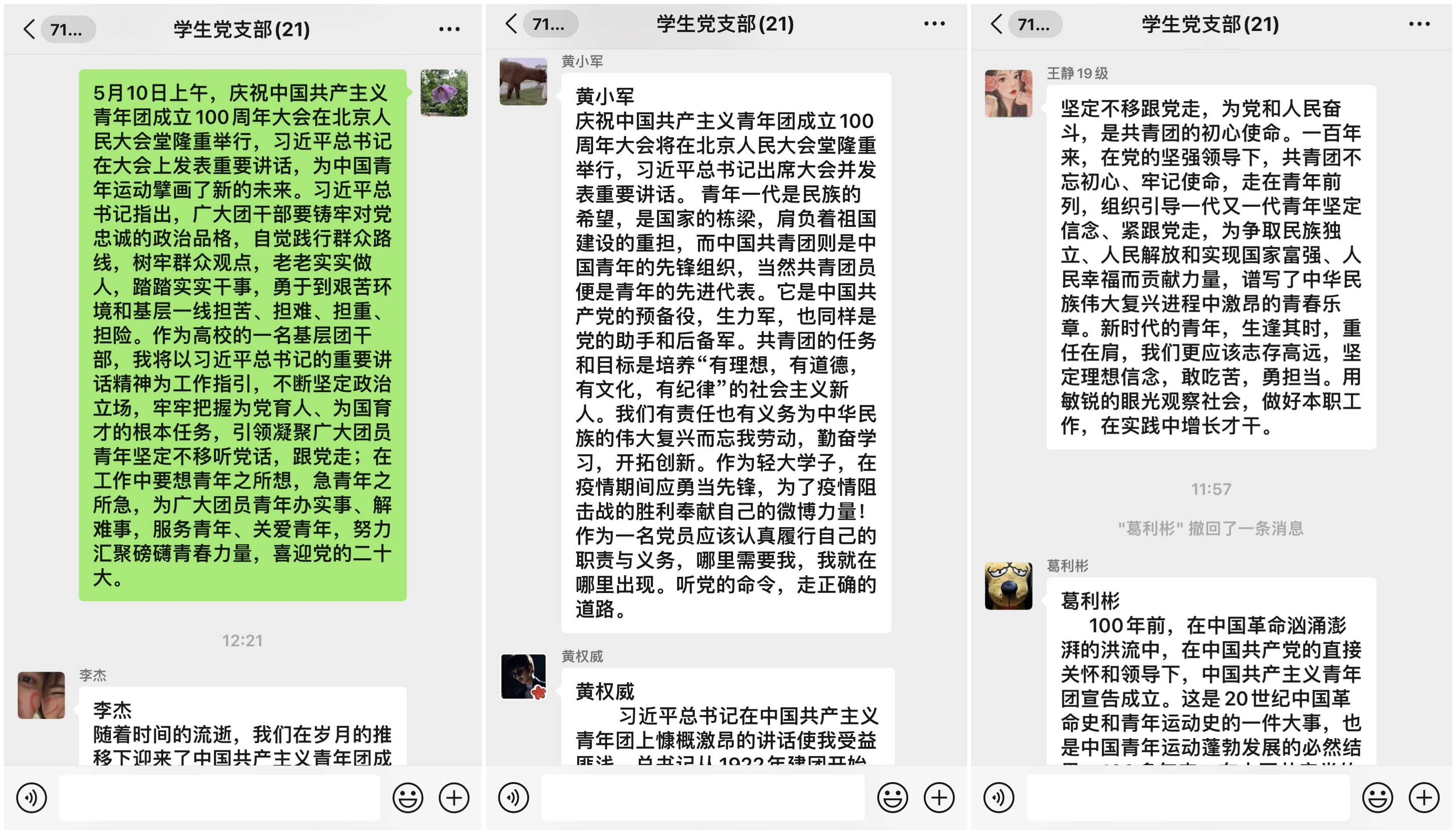 5月10日上午,庆祝中国共产主义青年团成立100周年大会在北京人民大会堂隆重举行,习近平总书记出席大会并发表重要讲话。自拍流出 学生党支部组织全体党员通过网络直播方式收看了庆祝中国共产主义青年团成立100周年大会现场直播盛况。