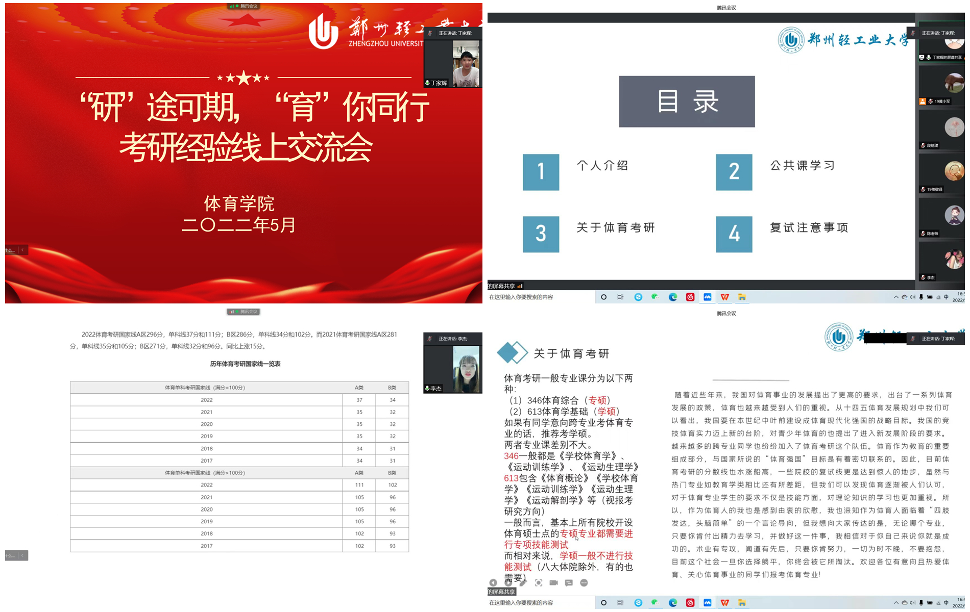 为提高学生的考研热情,促进优良学风建设,帮助学生对体育专业未来考研形势有了更深入的了解,明确考研目标,近日,自拍流出 通过腾讯会议线上举办“‘研’途可期,‘育’你同行”考研经验交流会。学工办副主任陈洁老师、2018级优秀考研学子及低年级全体学生参加此次活动。