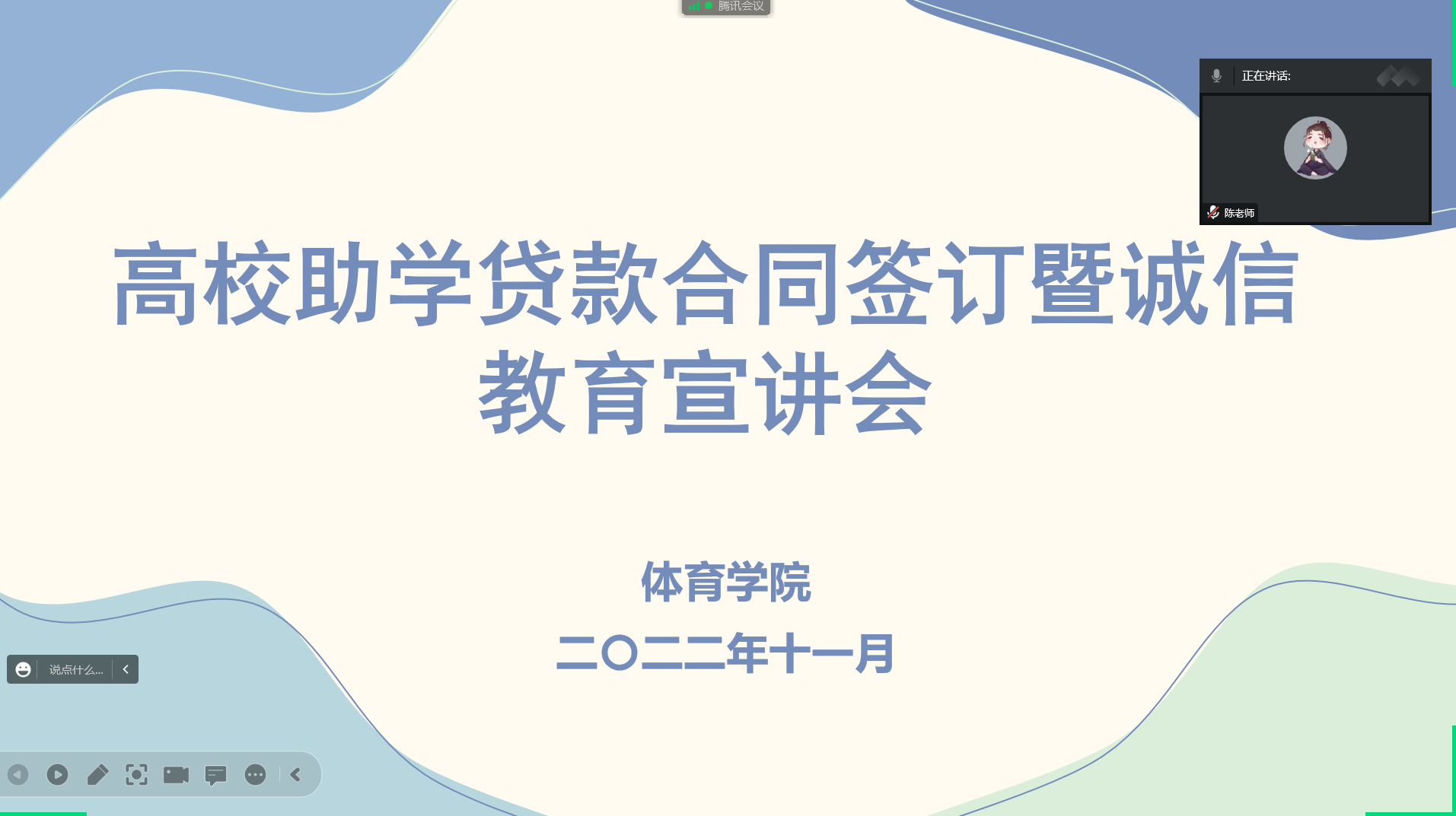 为宣传国家资助政策,增强贷款学生诚信还款意识,完善助学贷款工作流程,结合当前疫情防控要求,11月10日晚上,自拍流出 通过腾讯会议线上召开了2022年高校助学贷款合同签订仪式暨诚信教育大会。学院负责资助工作的陈洁老师、院学生会资助部及全体贷款学生参加了会议。