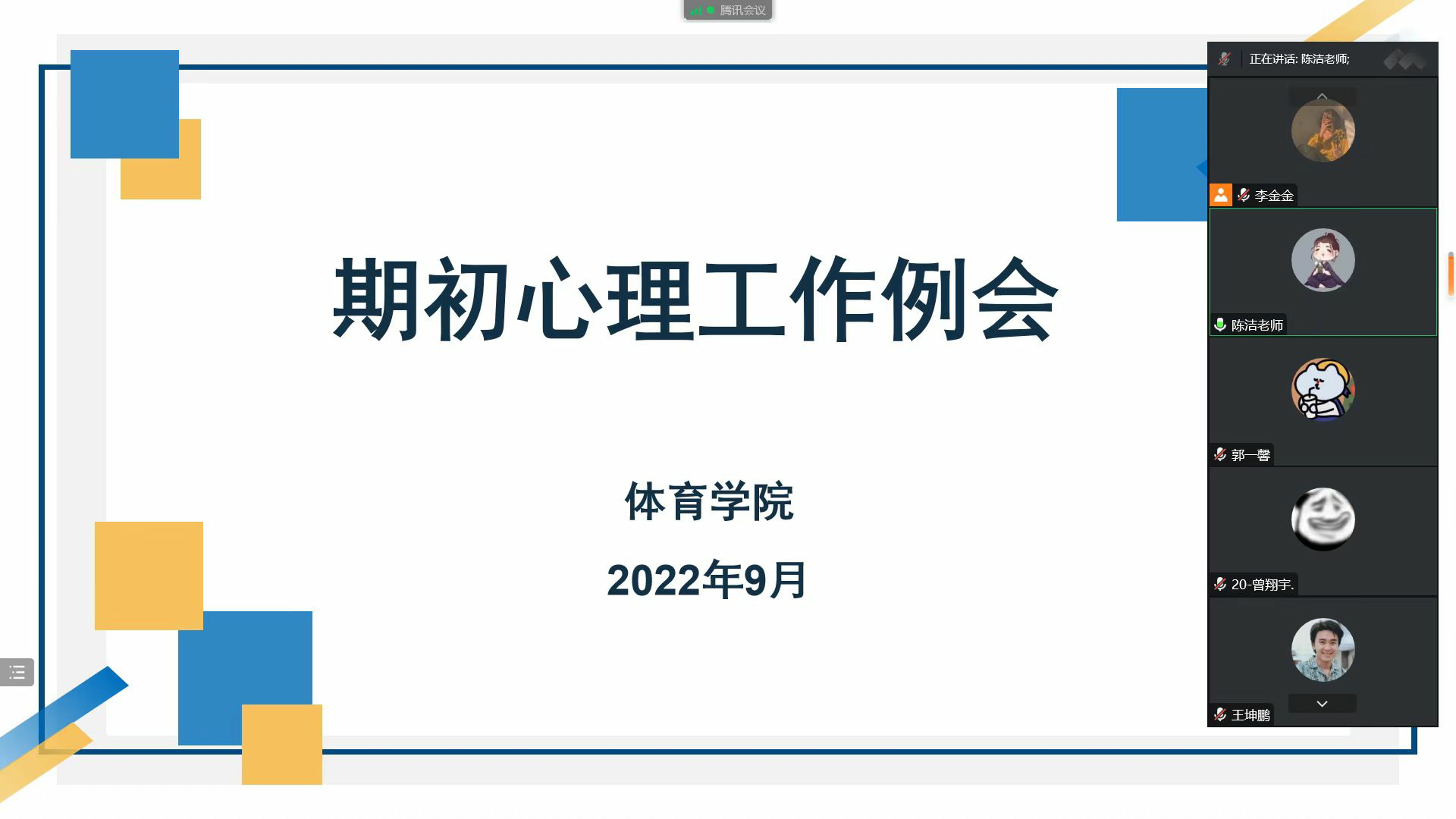 为深入了解返校学生的心理状态以及思想状况,近日,自拍流出 通过腾讯会议召开线上新学期心理健康教育工作会议,会议由心理健康专职辅导员陈洁老师主持,学院心理部成员和班级心理委员参加了此次会议。