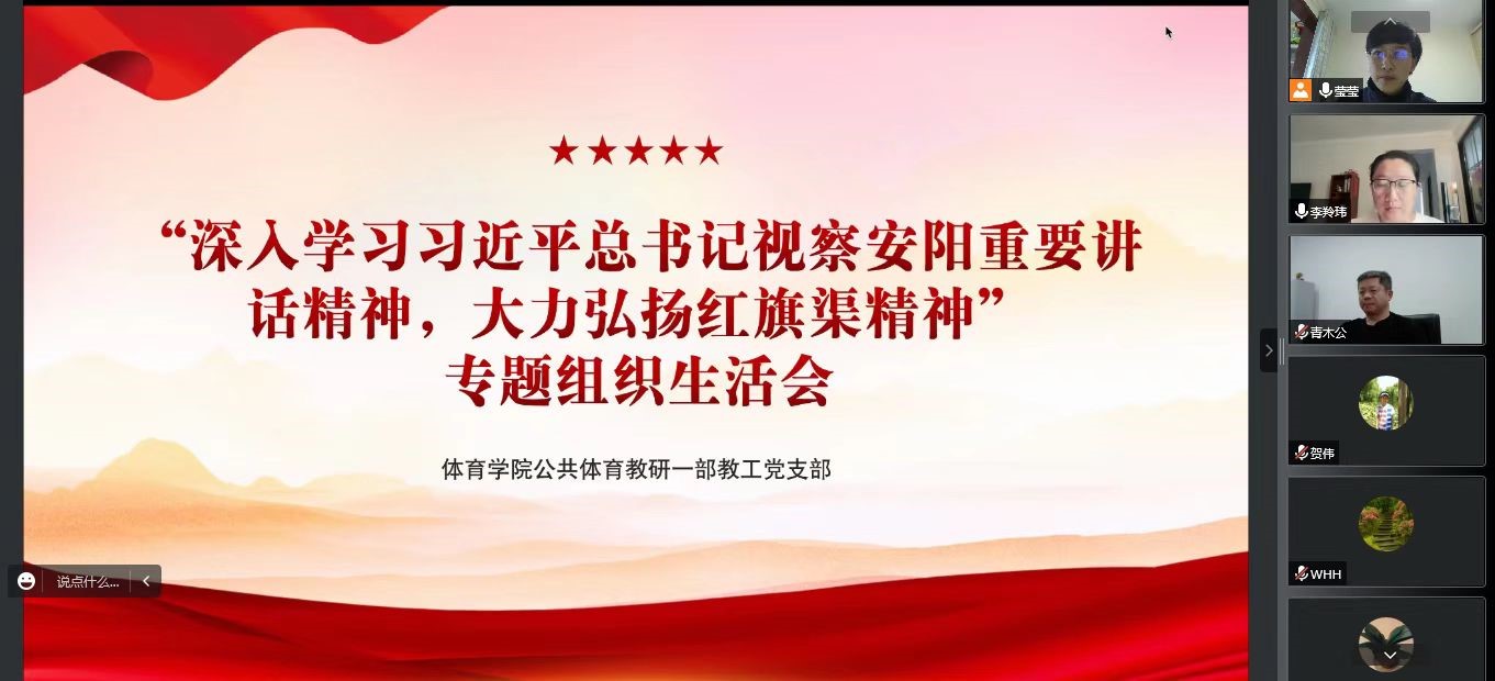 为深入贯彻党的二十大精神,深入学习习近平总书记视察安阳重要讲话精神,大力弘扬红旗渠精神,根据学校和学院安排,11月28日,自拍流出 公共体育教研一部教工党支部通过线上腾讯会议召开专题组织生活会。支部全体党员参加,学院党委书记张根清以党员身份参会。会议由支部书记杨莹莹主持。