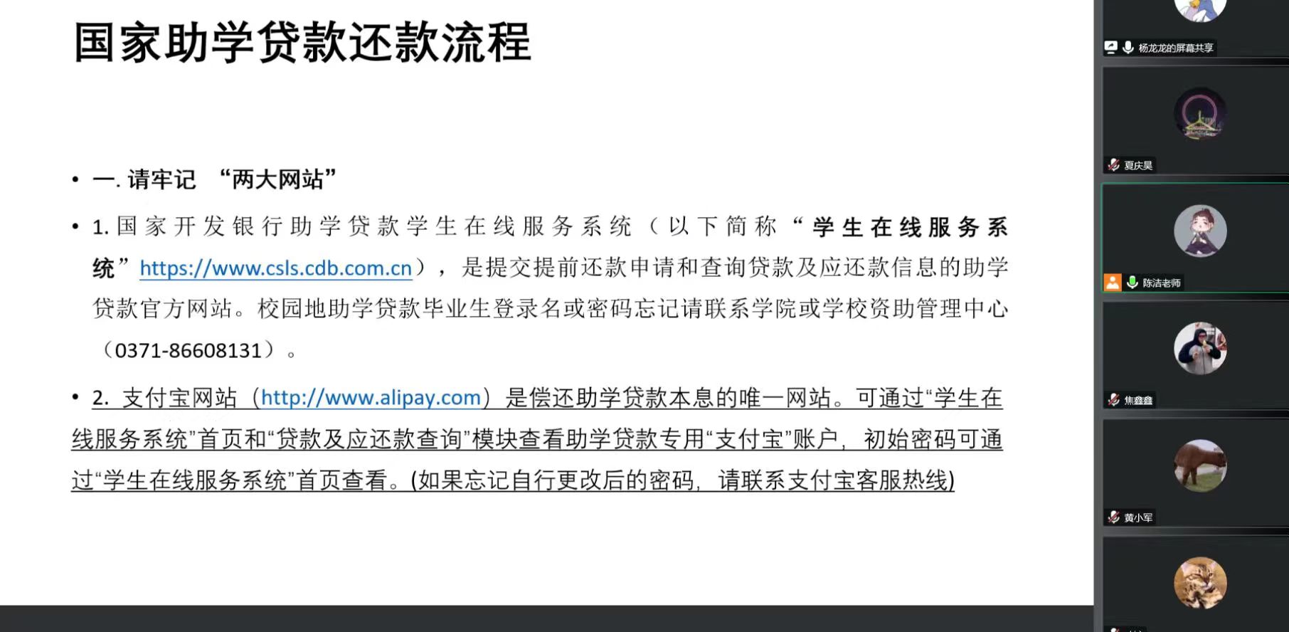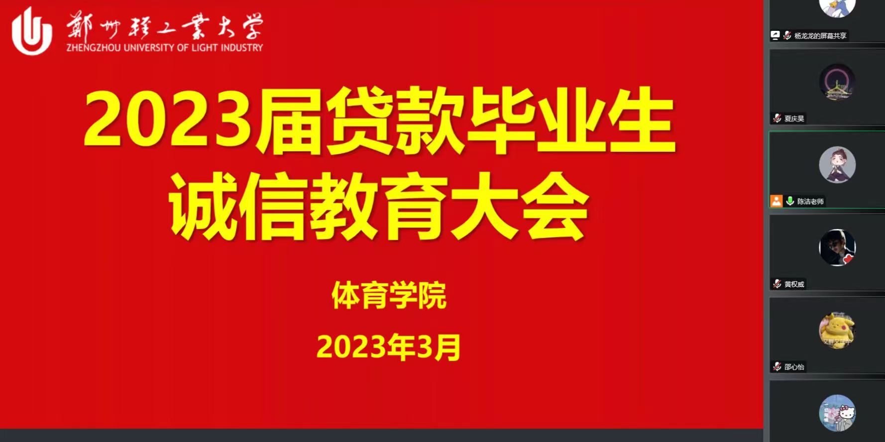 为增强同学们的诚信守诺意识,落实国家助学贷款相关政策,3月9日晚上,自拍流出 通过腾讯会议召开2023届贷款毕业生诚信教育会。会议由学院资助专职老师陈洁主持,2023届国家助学贷款毕业生参加了会议。