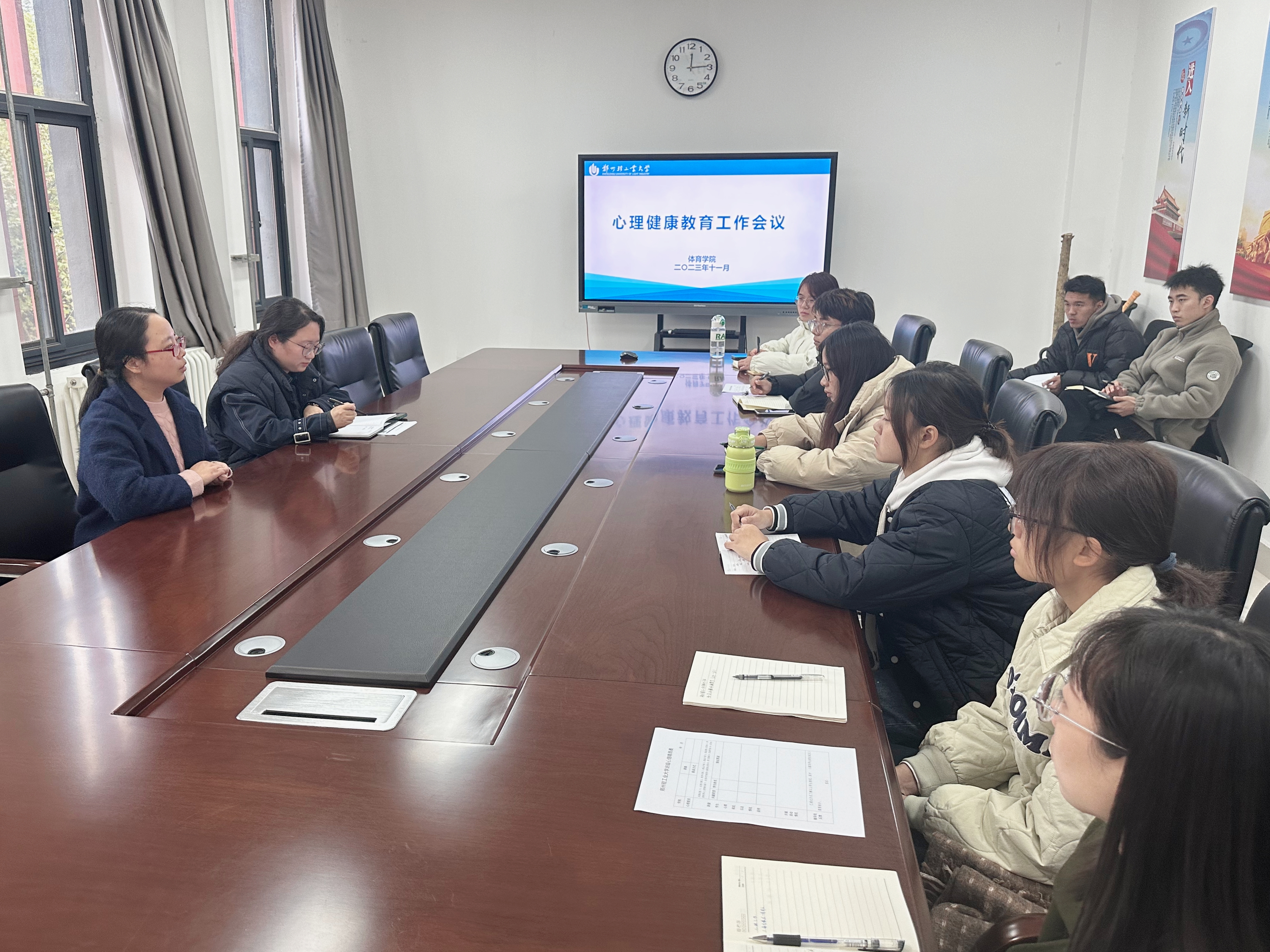 为进一步加强学生心理健康教育,提升学生心理健康素养,近日,体育学院在体育馆三楼会议室召开心理健康教育工作会议。学院党总支副书记王静、心理健康教育专职辅导员陈洁、学院心理部成员及班级心理委员参加了本次会议。