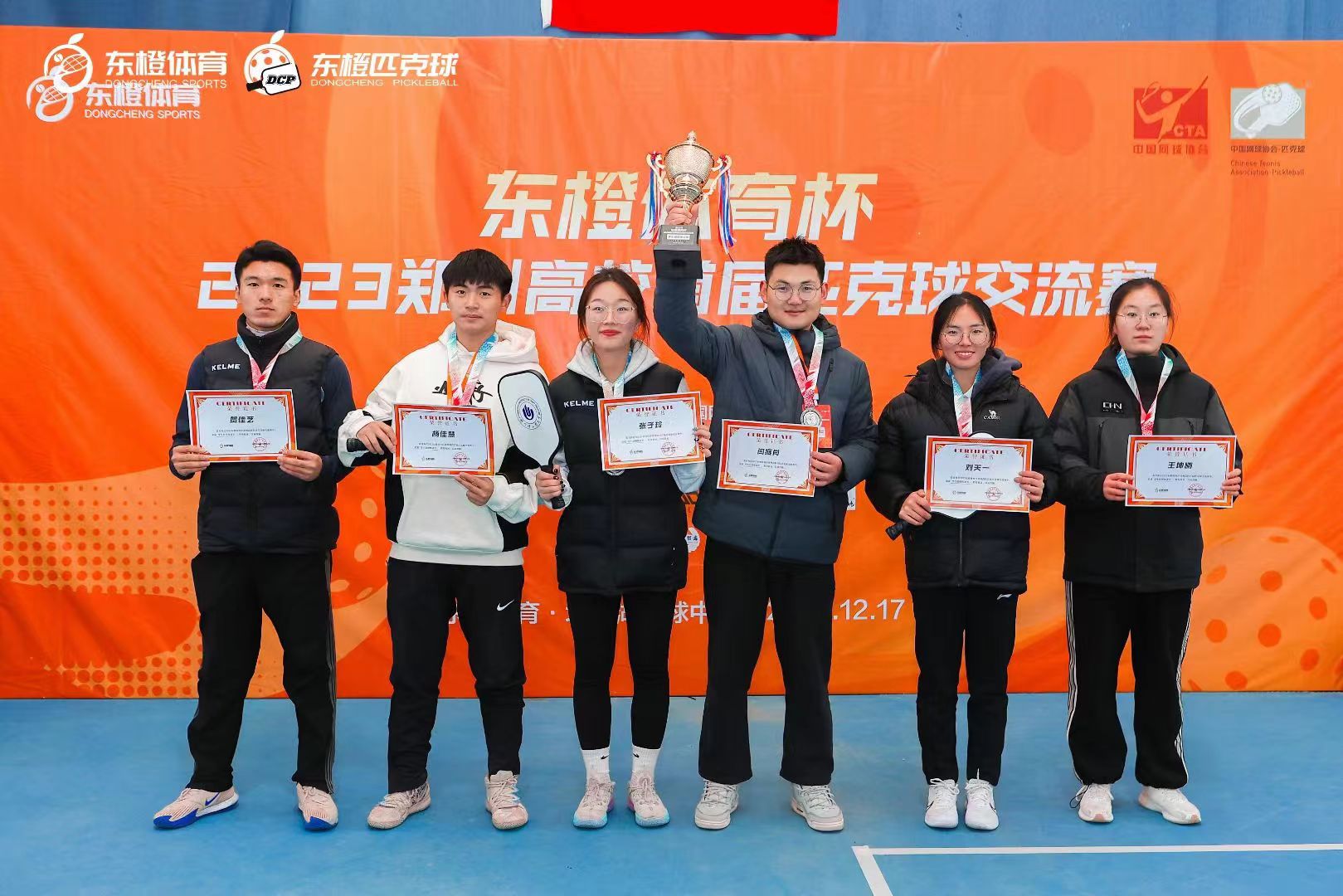 12月17日,由中国网球协会主办的“2023郑州高校首届匹克球交流赛”在北龙湖网球中心拉开序幕。比赛分为学生、教师组团体赛,共有来自郑州市8所高校的112余名师生运动员参加了本次比赛,经过一天的激战,我校匹克球队获学生组团体亚军、教师组团体季军。