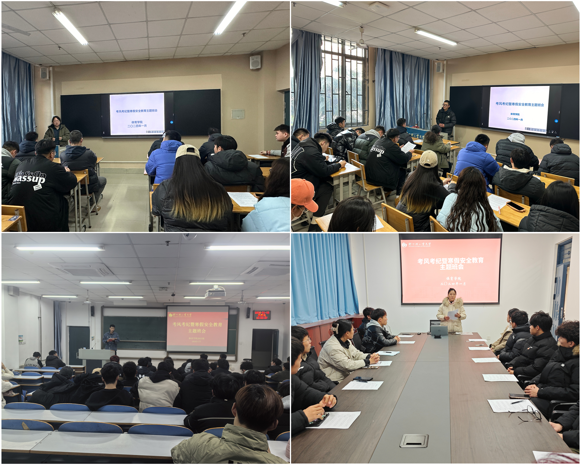 为严肃考风考纪,推进良好学风建设,做好学生寒假安全教育管理工作,确保学生有序离校,1月12日,体育学院全体辅导员、班主任分批组织学生召开期末考风考纪暨寒假安全教育主题班会。