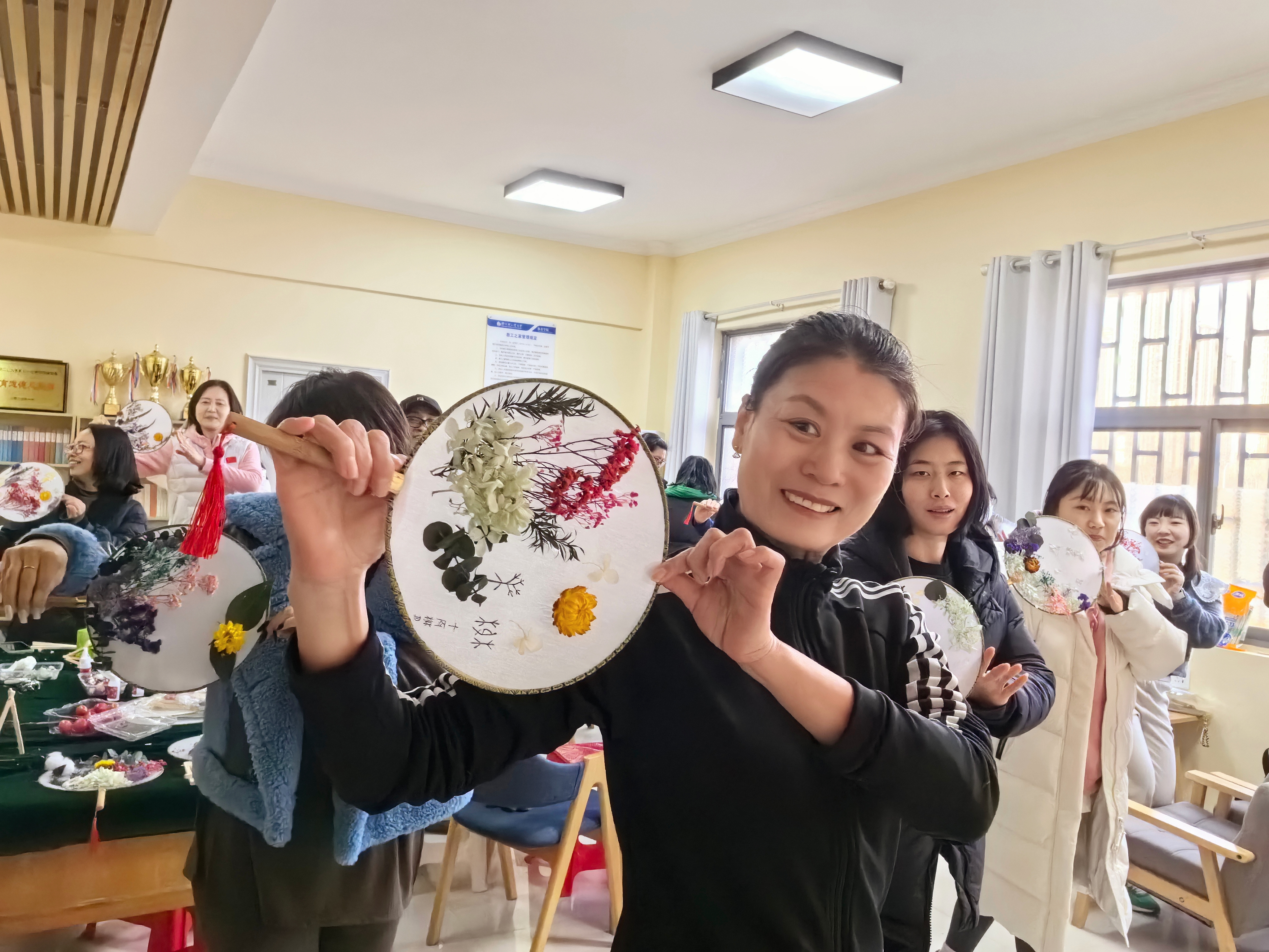 集中观看教学视频后,大家选花、裁剪、粘贴,用不同的色彩精心搭配出各式各样的造型。每个精美的团扇都是智慧和美丽的结合,是芳华的绽放,展现的是不被定义的“她”。随后,由邱廉洁老师进行团扇舞蹈现场教学。伴随着舒缓的音乐,大家手持团扇,尽展优雅舞姿。活动现场花香四溢,充满了欢声笑语。