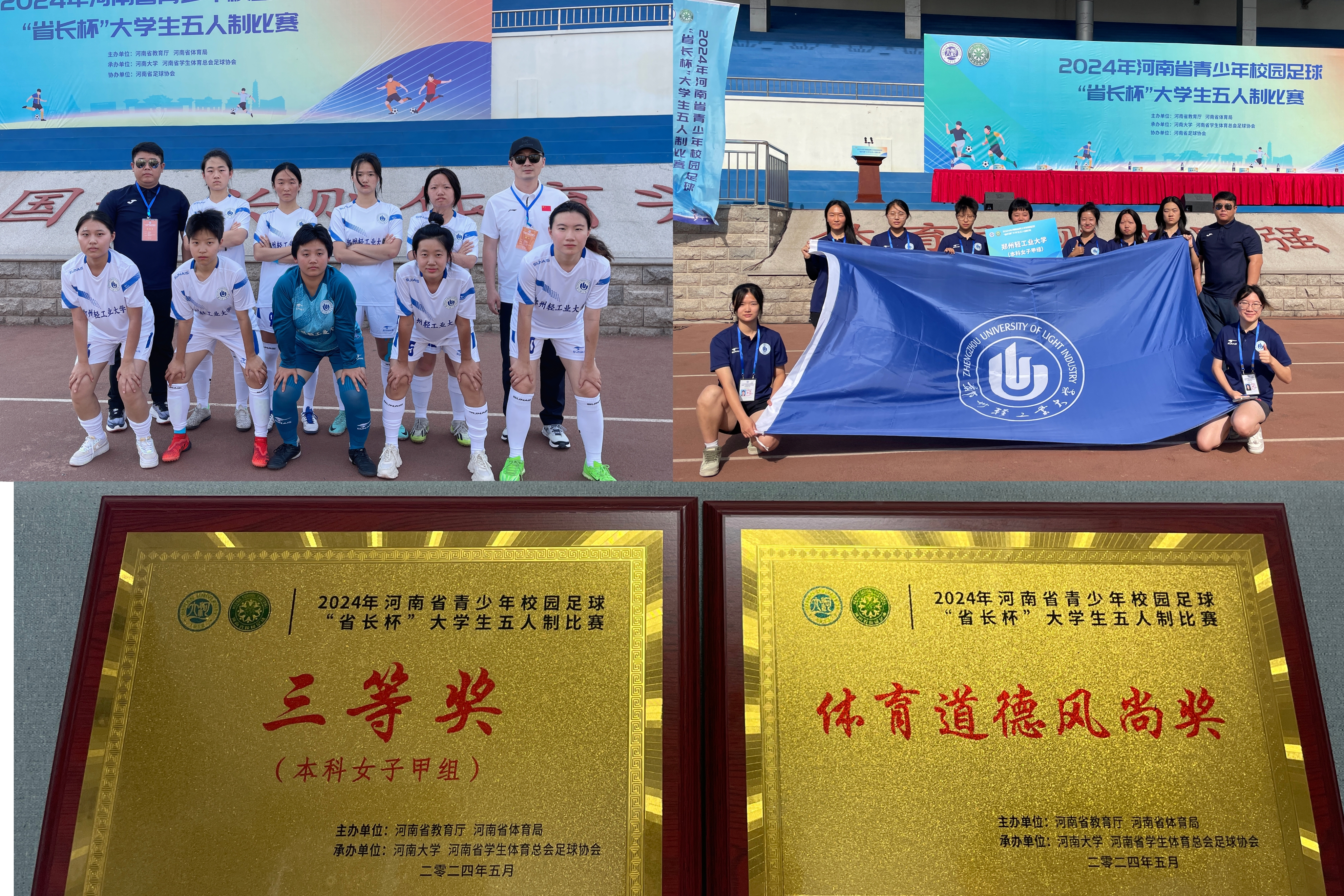 5月22日,由河南省教育厅、河南省体育局主办,河南大学、河南省学生体育总会足球协会承办,河南省足球协会协办的2024河南省青少年校园足球“省长杯”暨河南省传统特色学校比赛(大学组五人制)圆满落幕。我校足球队参赛并获得本科女子甲组“三等奖”和“体育道德风尚奖”。