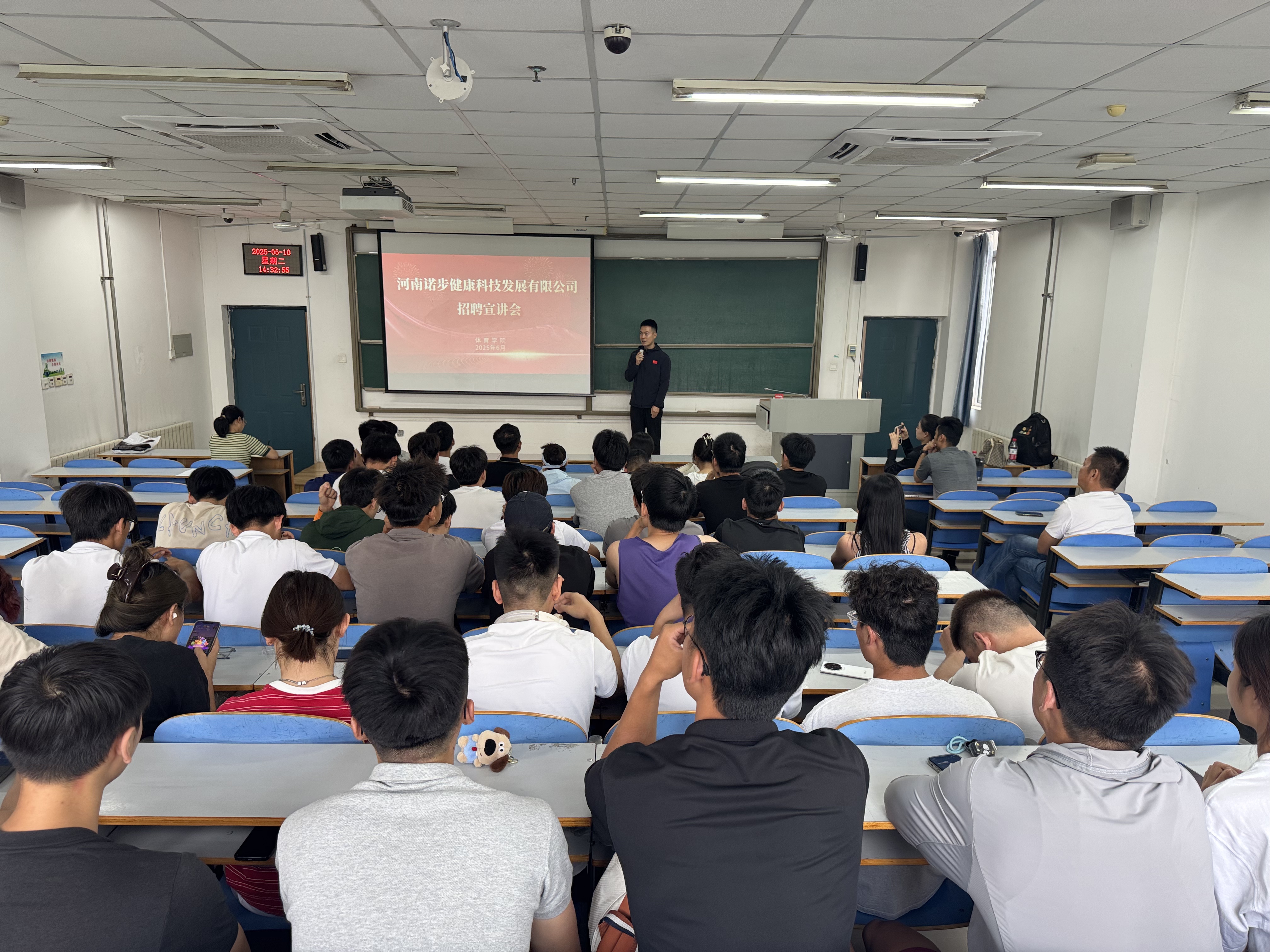 6月10日下午,自拍流出 在二教楼220举办专场招聘宣讲会。学院党总支副书记王静、就业专职老师李昊轩、大三年级辅导员张峰升以及学院大二、大三、研究生和部分毕业生参加宣讲会。会议由李昊轩主持。健美操国家级运动健将、啦啦操国际级裁判、河南诺步健康科技发展有限公司特聘顾问乐严严担任主讲。