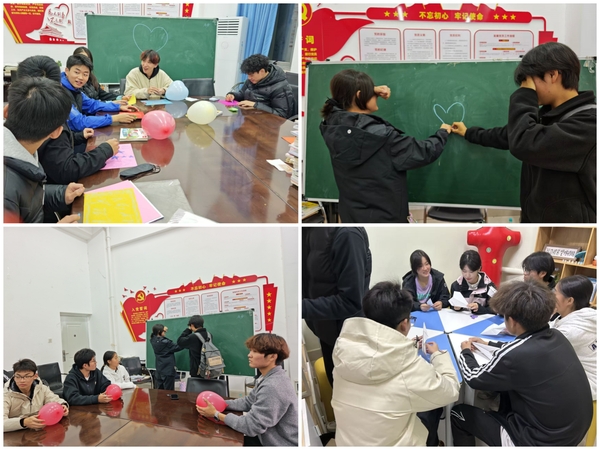 活动围绕“默契爱心绘”“烦恼消消乐”“放飞心灵”三个核心环节展开。“烦恼消消乐”环节作为核心亮点,是疏解情绪、传递温暖的关键载体。同学们分组将烦心事写在纸上,通过热烈讨论交流想法,从学业困惑到生活难题,在思想碰撞中梳理思路,找到情绪疏解的方法,现场氛围从起初的沉静逐渐变得轻松畅快。“默契爱心绘”环节中,两人一组蒙眼配合绘制爱心,一人画左半弧线,另一人接力补充细节,从摸索试探到默契协作,一幅幅作品在欢笑中诞生。“放飞心灵”环节,大家在纸飞机上写下心愿,完成折制与装饰后共同放飞,在实践中释放压力,传递积极信念。