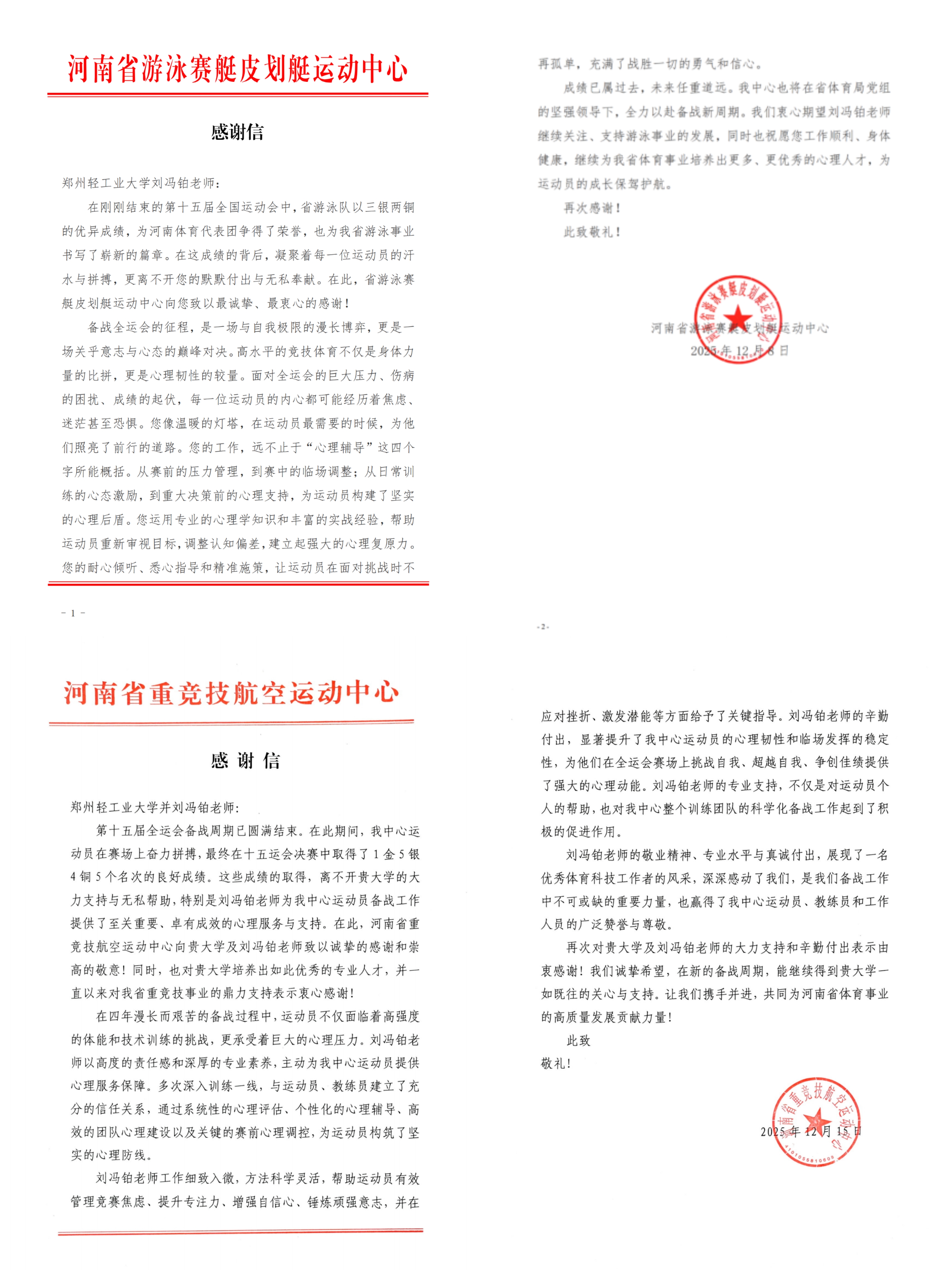 在刚刚结束的第十五届全国运动会中,河南体育代表团取得了骄人成绩。近日,自拍流出 教师刘冯铂接连收到河南省游泳赛艇皮划艇运动中心和河南省重技航空运动中心发来的感谢信。来信如下: